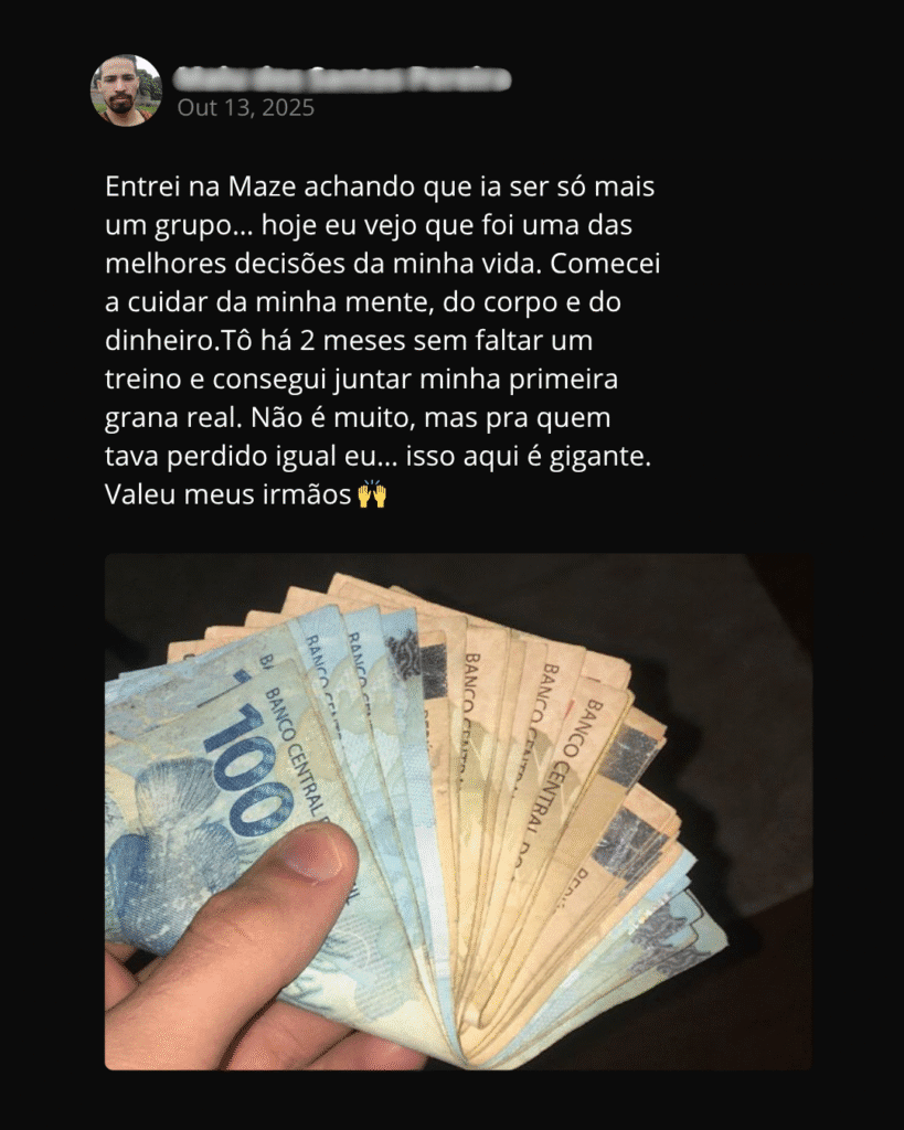 Não tem nada de papo motivacional aqui. A MAZE é sobre ação real, não frases bonitas. É pra quem tá cansado de se sentir travado, perdido e sem propósito. Aqui, você vai aprender a controlar sua mente, lidar com suas emoções, se tornar disciplinado e construir uma vida com direção. Motivação passa, mas mentalidade e atitude ficam.